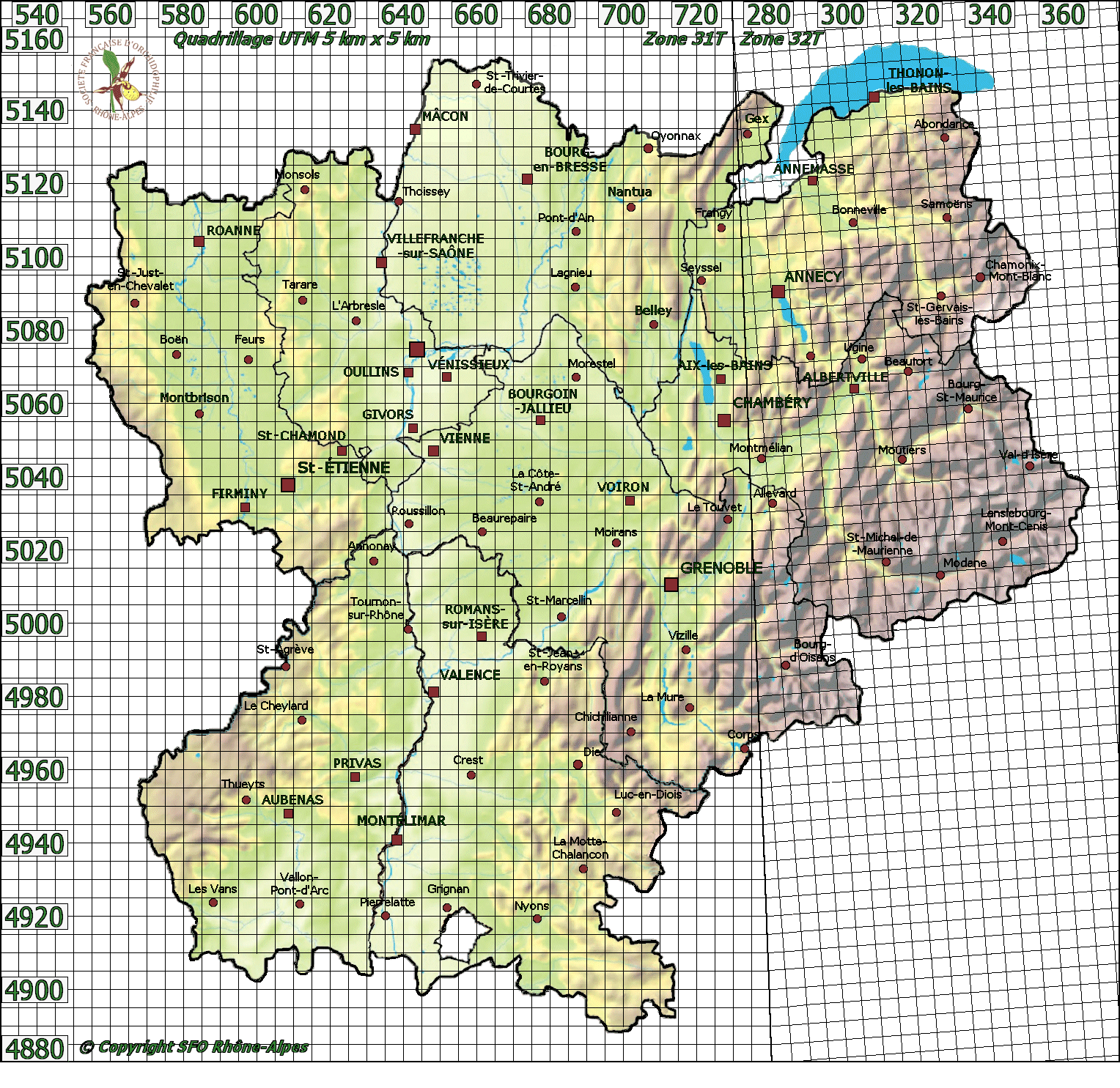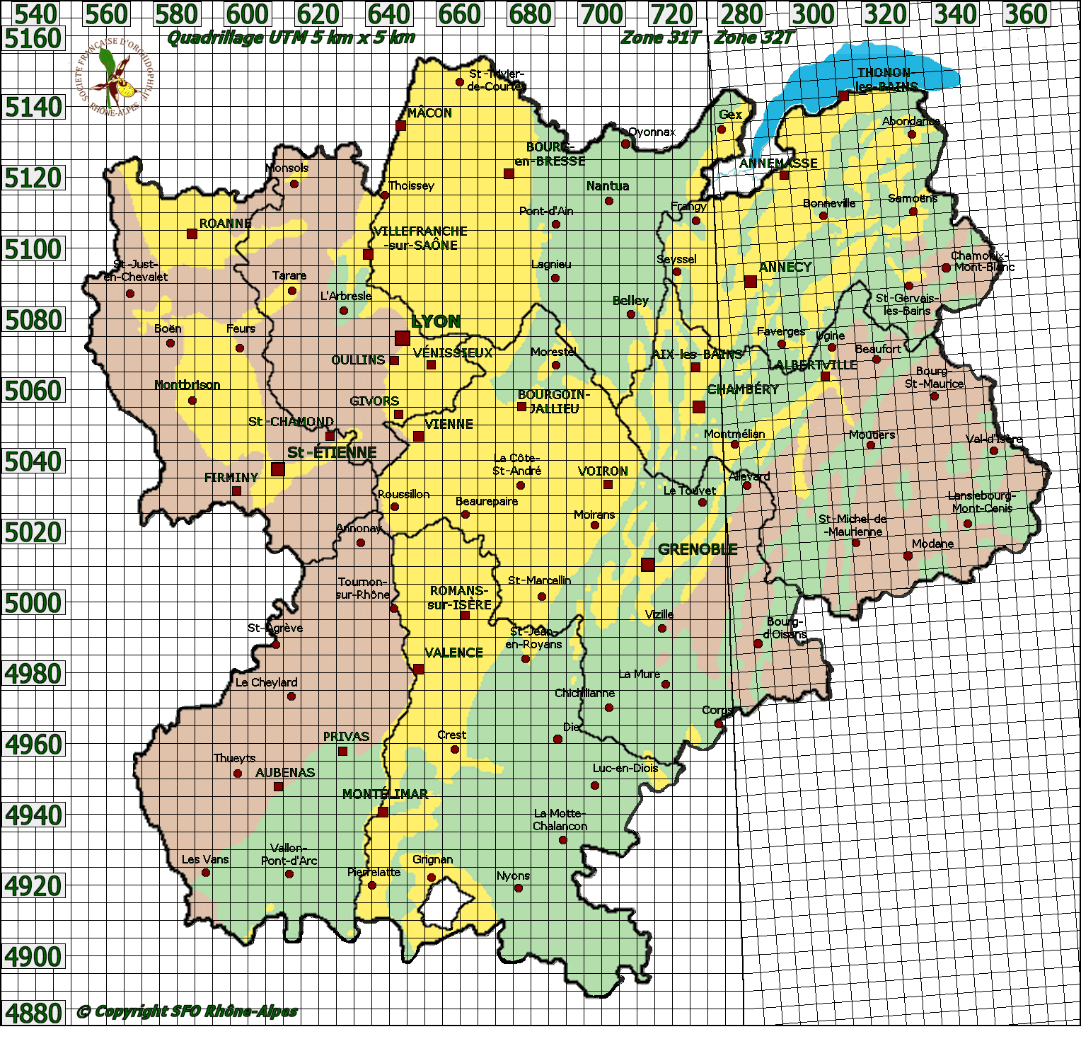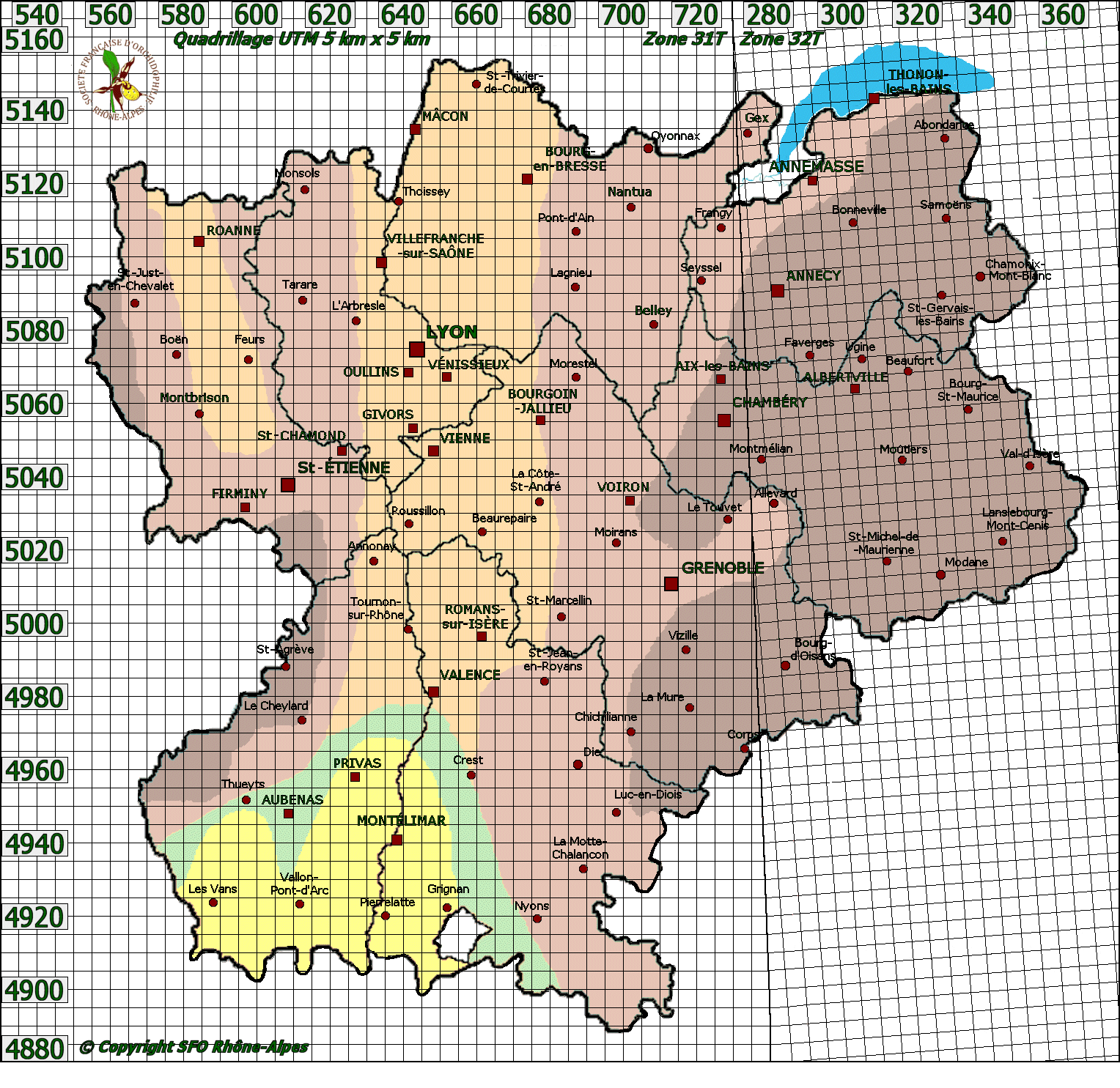 Cartographie par mailles de 5 km x 5 km :